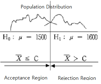 A statistical approach to the question of this issue is first to make two assumptions about the different arguments for the population mean μ . Namely, $$ \small \begin{multline} \shoveleft H_0 : μ = 1500 \\ \shoveleft H_1 : μ = 1600 \end{multline} $$ \(\small H_0\) is called a null hypothesis and \(\small H_1\) is an alternative hypothesis. In most cases, the null hypothesis is defined as an ‘existing known fact’ and the alternative hypothesis is defined as ‘new facts or changes in current beliefs’. So when choosing between two hypotheses, the basic idea of testing a hypothesis is 'unless there is a significant reason, we accept the null hypothesis (current fact) without choosing the alternative hypothesis (the fact of the matter). This idea of testing a hypothesis is referred to as ‘conservative decision making’.